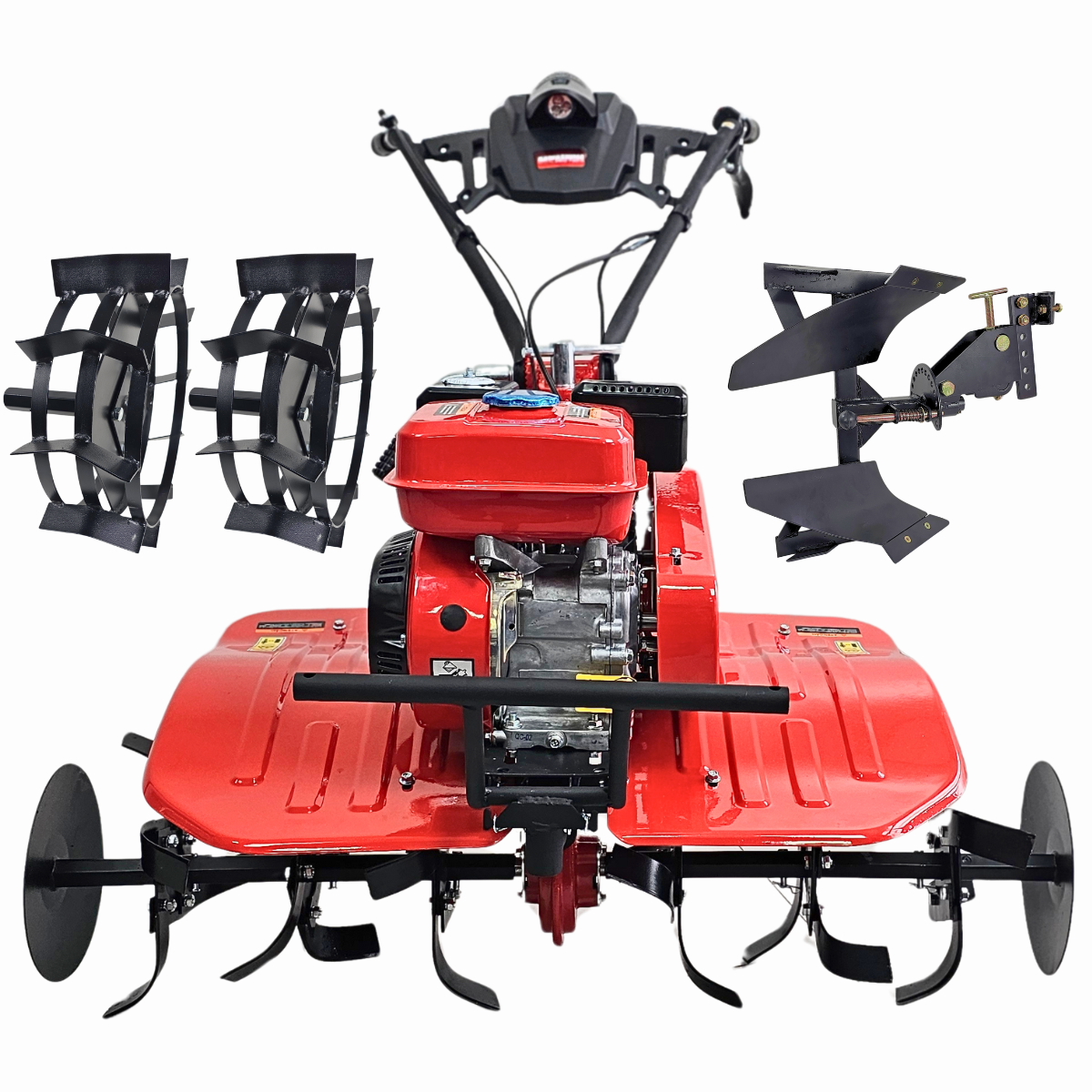 O conjunto com enxadas rotativas, rodas pneumáticas e rodas de ferro permite configurar o equipamento conforme o tipo de terreno, garantindo estabilidade, tração e controle operacional.
